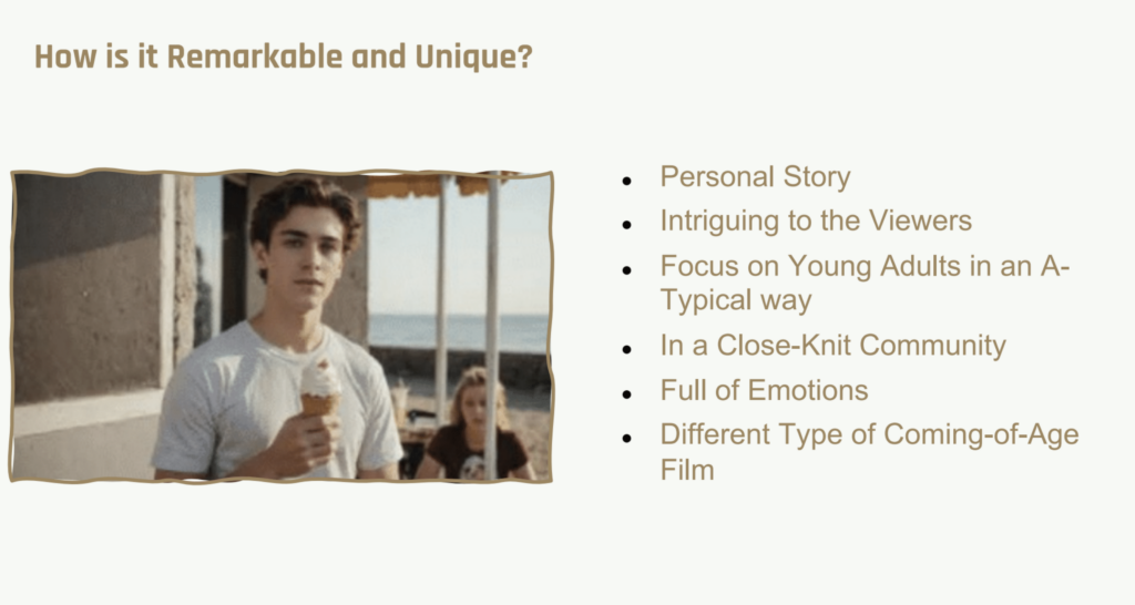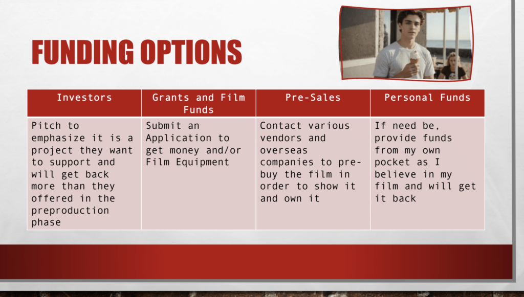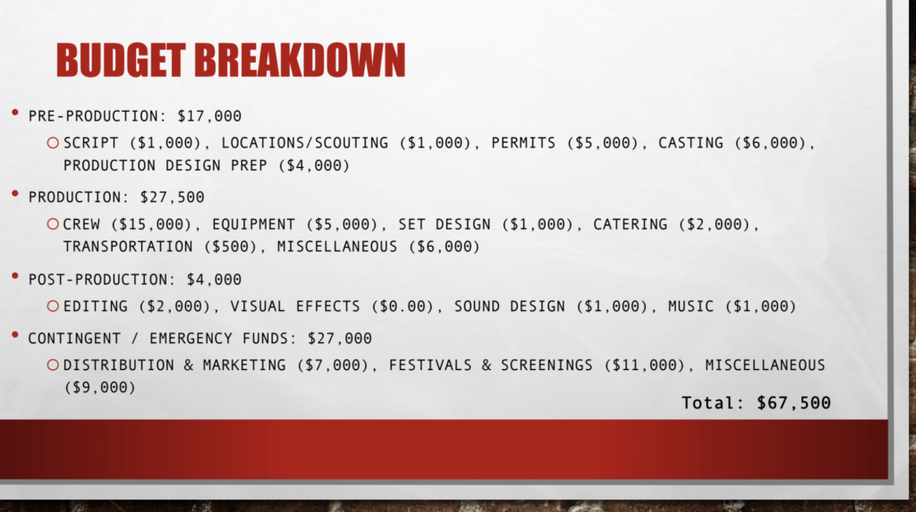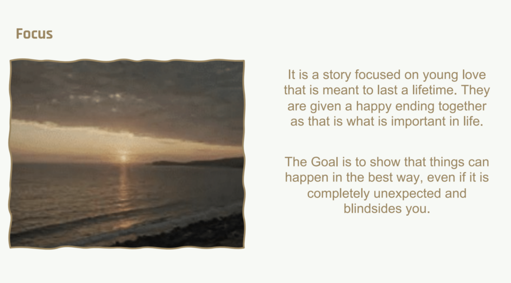DESCRIPTION: A short film of love, and the growth of Cole and Ashley’s relationship. They met in English class and have gone on adventures through their small coastal town of Vinal Haven Maine. Throughout this course, I took the script, broke it down, and created the preproduction documents needed to take this project into the phase. To help pitch my project to investors and other audiences, I created a pitch and a budget presentation.