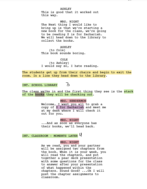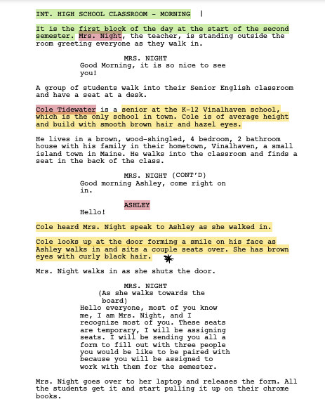 DESCRIPTION: The script breakdown for a short film of love, and the growth of Cole and Ashley’s relationship. They met in English class and have gone on adventures through their small coastal town of Vinal Haven Maine. Throughout this course, I took the script and did a breakdown to identify props, costumes, places, pets, vehicles, etc.