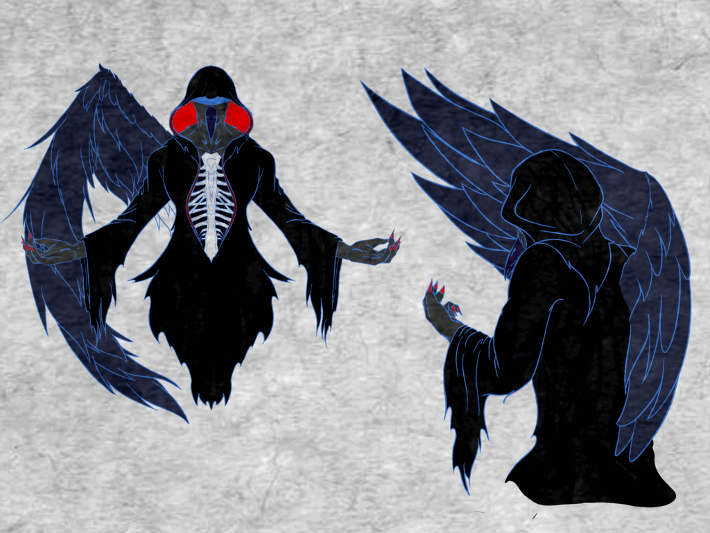 DESCRIPTION: Death himself, he blends into the shadows and tries not to be seen by mortals. I used the theme of a crow as usually death is resembled by skeletons and black robes. Crows in many mythologies and religions are symbols of death and decay.