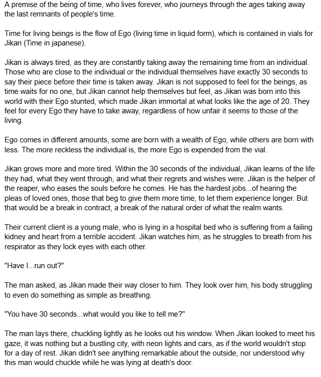 DESCRIPTION: This passage tells the story of Jikan, an immortal embodiment of Time who collects the final moments called Ego, from those about to die. Though meant to be emotionless, Jikan feels deep empathy for the lives they touch, burdened by centuries of witnessing sorrow and pleas for more time. During one encounter with a dying young man, Jikan is moved by the man’s love and struggles. Defying the natural order, Jikan restores part of the man’s Ego, giving him more time to live. The act physically ages and weakens them, symbolizing the personal cost of compassion. Afterward, Jikan faces Kibishi, a grim reaper figure who warns that such emotions will destroy them. Still, Jikan accepts the consequence, walking into darkness beside Kibishi as the revived man awakens miraculously—proof that even time itself can bend for compassion.